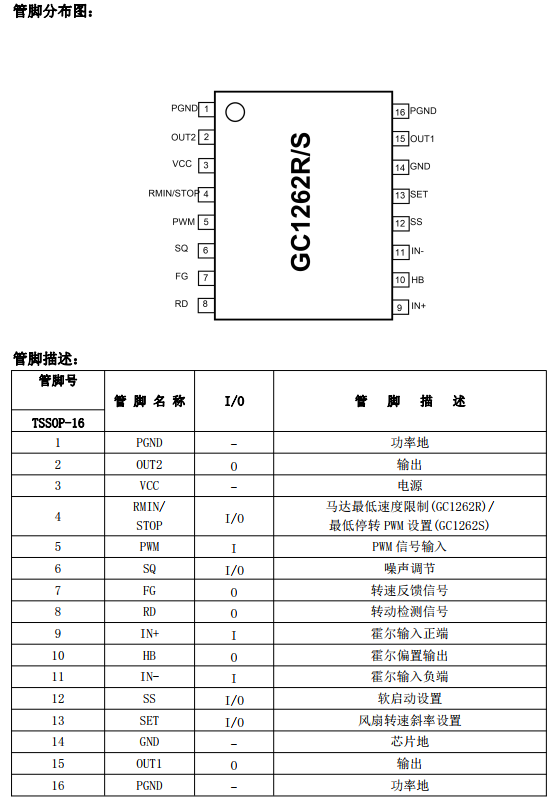 GC1262R/S 是单线圈无刷直流电机的电机驱动器。 GC1262R/S 具有高效的直接PWM 控制方式, 它可以控制无刷直流电机转速。 它集成了最低速度限制模式、 可调速度斜率控制模式、 软启动模式、 风扇转速计、锁保护、 自动重启、 TSD、 OCP 和噪声控制模式, 噪声控制模式根据不同的要求, 利用 SQ脚的电阻优化低噪声性能, 可以实现 BLDC风扇电机低噪声、 低振动。 最低转速模式可以通过预设 RMIN 电压来设定最低电机转速。可调速度坡度控制模式可以通过预设 SET 电压来设置风扇速度坡度。 软启动抑制高峰值启动电流, 即使在低转速下也能提供可靠的启动。 GC1262R/S 具有 FG, RD 输出。