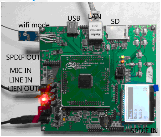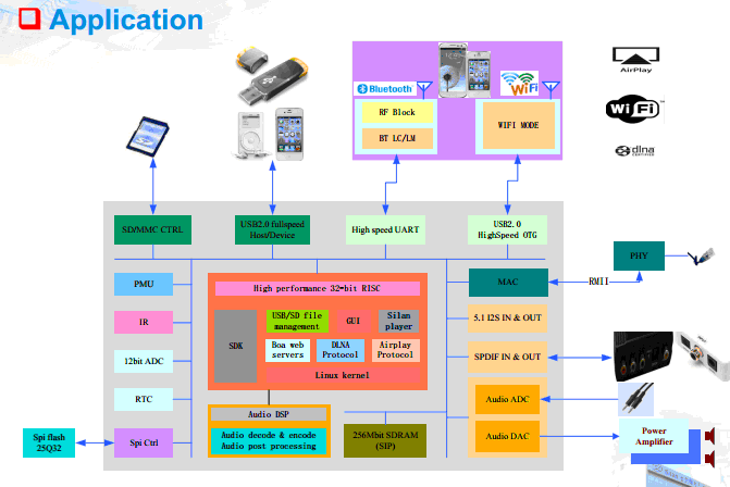 该芯片集成了2.0 High Speed USB控制器(内置PHY), SD/MMC/SDIO控制器,100M以太网,高速UART,Audio ADC和DAC,5.1 I2S in/out和SPDIF in/out等音频接口,内置了RTC,A/D模块和UART/SPI Master/I2C/PWM接口,并采用先进的SMIC 0.11G工艺,100-PIN LQFP封装,叠封SDRAM,非常适合音乐播放、无线推送和音效处理等多方面的应用。
